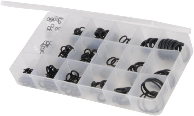 Gumigyűrűk készlete axiális tömítéshez levegőben, vízben. Belső méretek 3–22 mm.